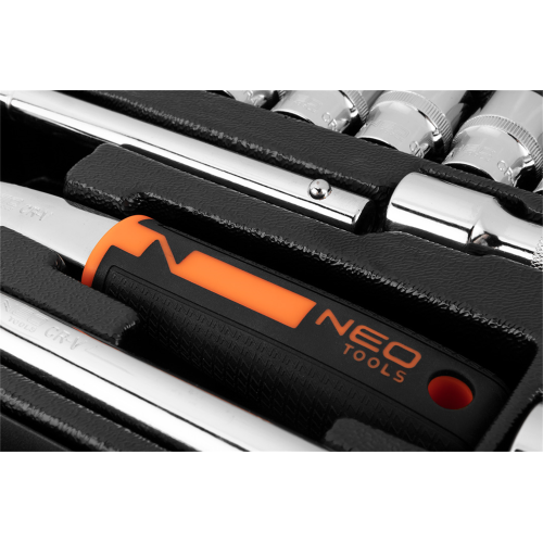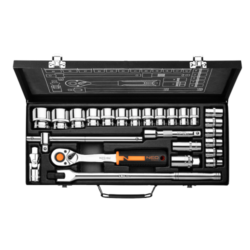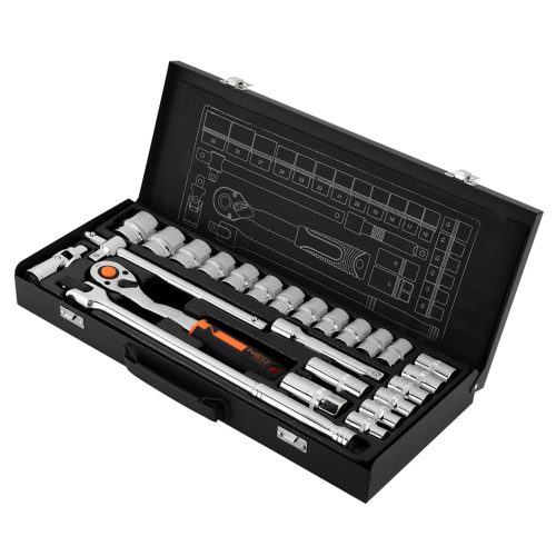 Klucze nasadowe 1/2”, zestaw 25 sztuk, CRV, 10-036 NEO to wysokiej jakości komplet 25 sztuk produktów, oferowanych w wygodnej walizce z metalu z solidnymi zatrzaskami. Narzędzia oferowane w zestawie zostały wykonane z wysokiej jakości stali chromowo-wanadowej. Charakteryzują się także nowym wzorem uchwytów – antypoślizgowy materiał na grzechotce z przewagą czerni i dodatkiem koloru pomarańczowego to praktyczne rozwiązanie, które sprawdzi się w każdym warsztacie.