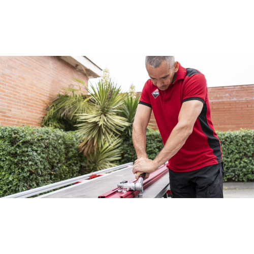 Prowadnice przecinarki, podobnie jak wózek z kółkiem tnącym, są wykonane z aluminium, co przekłada się na trwałość, ale też lekkość całego zestawu. Odpowiednio zaprojektowane szyny oraz wyposażenie wózka w trzy łożyska poziome pozwala na płynne prowadzenie urządzenia i łatwe nacinanie płytek. Producent zadbał również o solidne przyssawki prowadnic z gumowymi niebrudzącymi się podstawami – zapewniają nie tylko stabilność, ale mogą być użytkowane na jasnych materiałach bez ryzyka ich zabrudzenia.