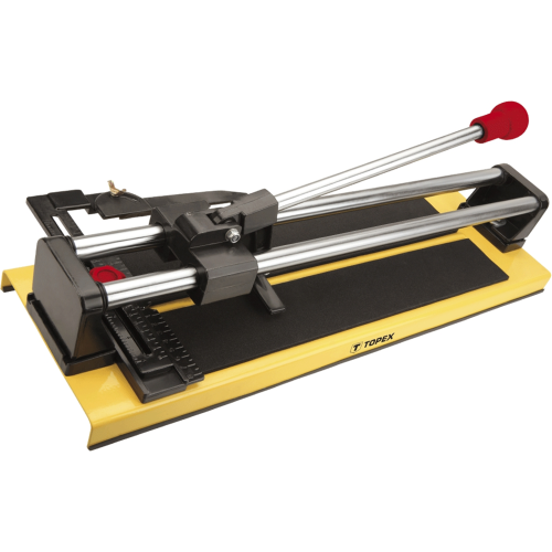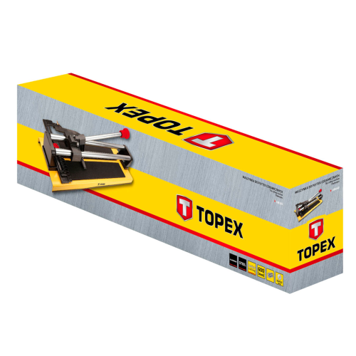 Maszynka do płytek ceramicznych TOPEX (nr ref. 16B160) o długości 600mm z nożem o wymiarach 22x6x2mm. Znajduje swoje zastosowanie podczas prac glazurniczych. Posiada podwójne prowadnice rurowe o średnicy 20mm. Płynne prowadzenie noża na prowadnicy umożliwiają zastosowane łożyska kulkowe. Aluminiowy blat wyposażony w miarę metryczną oraz kątownik. Marka TOPEX skierowana jest do majsterkowiczów.