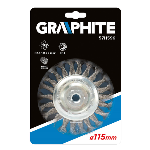 Szczotka druciana GRAPHITE (nr ref. 57H596) o średnicy 115mm, wykonana z drutu ze stali nierdzewnej o grubości 0.5mm. Wzmocniona konstrukcja korpusu pozwala na wydajne czyszczenie konstrukcji stalowych ze stali nierdzewnej i stali kwasoodpornej. Mocowanie przystosowane do współpracy ze szlifierkami kątowymi.