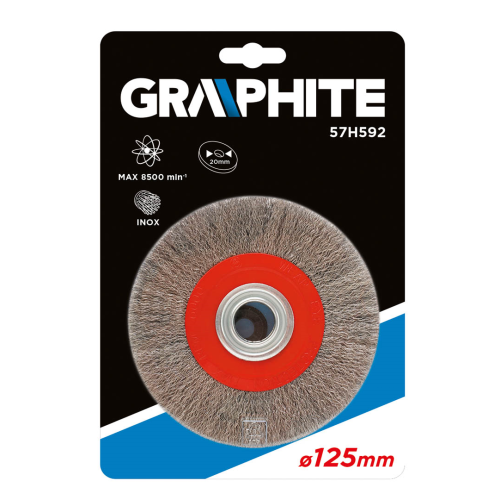 Szczotka druciana GRAPHITE (nr ref. 57H592) o średnicy 125mm, wykonana z drutu ze stali nierdzewnej o grubości 0.5mm. Wzmocniona konstrukcja korpusu pozwala na wydajne czyszczenie konstrukcji stalowych ze stali nierdzewnej i stali kwasoodpornej. Mocowanie przystosowane do współpracy ze szlifierkami kątowymi.