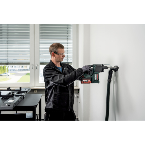 Kombimłotek SDS-Plus KH 18 LTX BL 24 Metabo 601713800 z bezawaryjnym silnikiem bezszczotkowym gwarantuje dłuższą żywotność modelu. Możliwość wiercenia z udarem i bez oraz podkuwania sprawia, że operator może za pomocą jednego narzędzia wykonać kilka zadań na miejscu pracy. Pełnookresowa elektronika Vario-Tacho-Constamatic wprowadza możliwość dostosowania prędkości obrotowej do wykonywanego zadania, podtrzymując jednocześnie stała wartość obrotów pod obciążeniem dla większej precyzji pracy. Prowadzenie działań jest bardzo komfortowe, także przy pracy ciągłej, dzięki Metabo Vibratech, czyli technologii redukującej drgania. Funkcja łagodnego rozruchu sprawia, że rozpoczynanie pracy jest wygodniejsze, ponieważ charakterystyczne rwanie jest eliminowane. Zastosowanie zatrzaskowego sprzęgła przeciążeniowego odłącza napęd w sposób mechaniczny, gdy wiertło zablokuje się w materiale, zapobiegając odrzutowi. Model posiada oświetlenie LED, wobec czego praca w ciemnych miejscach jest bezpieczna, precyzyjna i komfortowa. Do urządzenia można dokupić system odsysania pyłu ESA Plus, celem zachowania większej czystości na miejscu pracy. Narzędzie jest kompatybilne z akumulatorami 18V i ładowarkami marek CAS, co świadczy o jego wszechstronności.