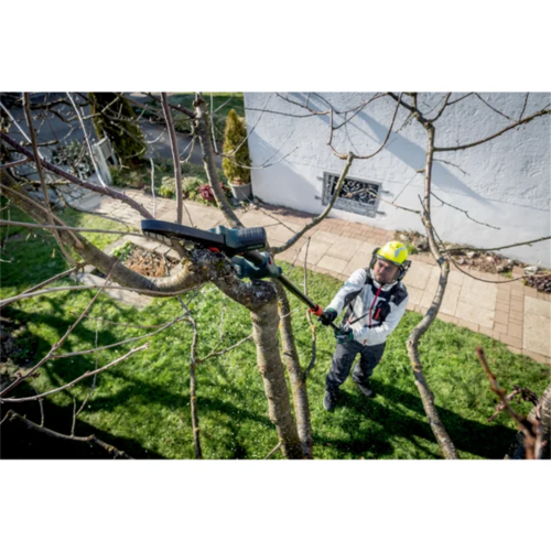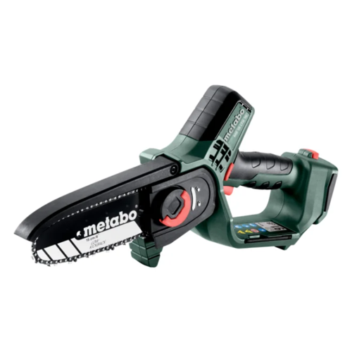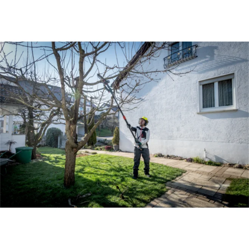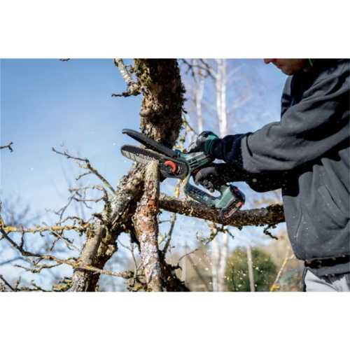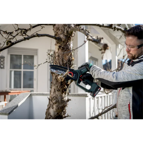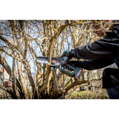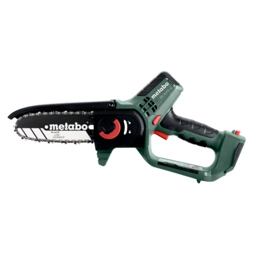 Akumulatorowa pilarka łańcuchowa MS 18 LTX 15 Metabo to uniwersalne narzędzie, które umożliwia zarówno cięcie gałęzi, jak też niedużych elementów konstrukcyjnych z drewna. Świetnie sprawdza się jako ręczna piła, a po doposażeniu jej w wysięgnik MS (dostępny oddzielnie) również jako okrzesywarka.
