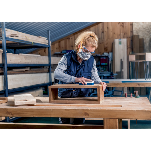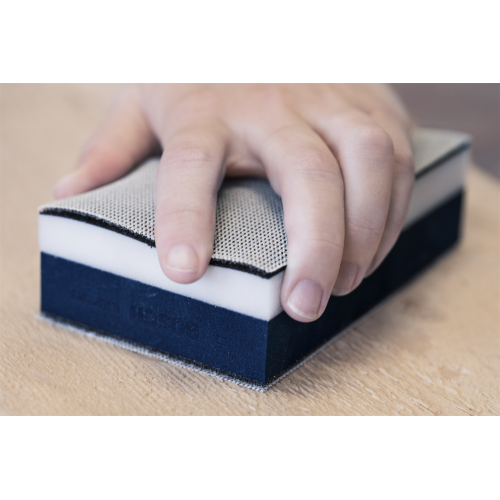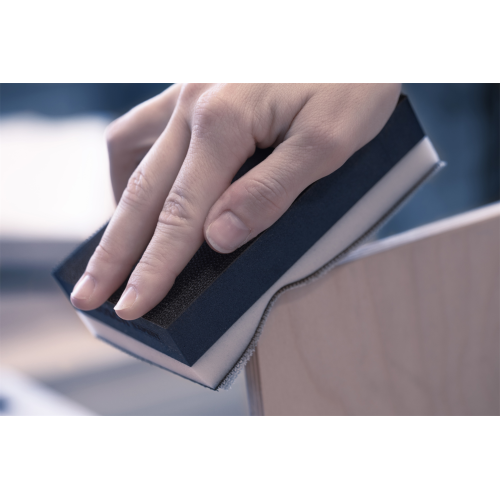 Jednym z najważniejszych atutów tego produktu jest jego podwójna gęstość – twarda i miękka strona pozwalają na efektywne szlifowanie zarówno płaskich powierzchni, jak i skomplikowanych profili. Ten funkcjonalny blok ścierny jest łatwy w obsłudze: wystarczy przykleić siatkę szlifierską na rzep. Zastosowanie siatek ściernych pozwala na redukcję ilości pyłu podczas pracy.