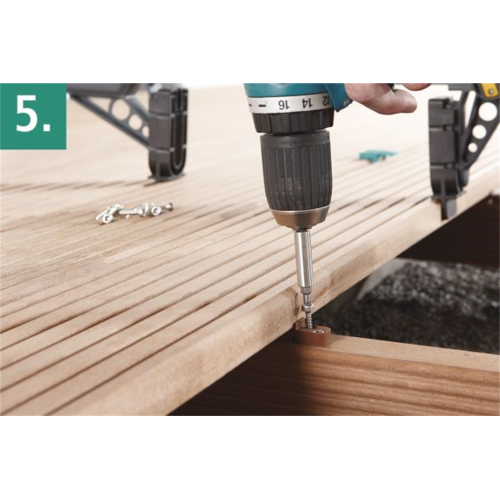 • Brak konieczności kaleczenia deski wkrętami od góry w celu przykręcenia pierwszej/ostatniej deski