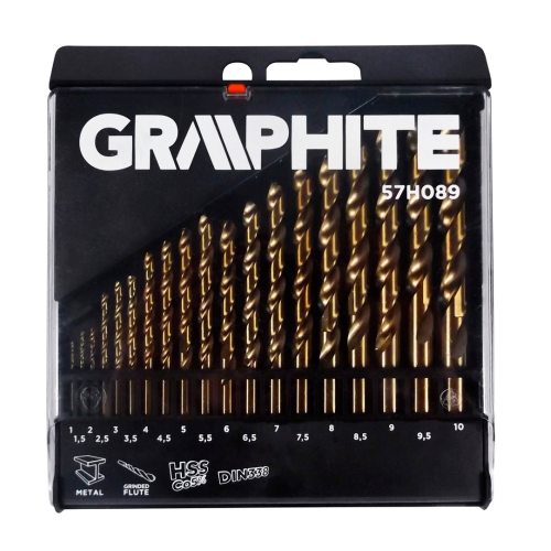 Wiertła do metalu GRAPHITE (nr ref. 57H089) wykonanych z wysokogatunkowego stopu stali szybkotnącej M35 z 5% dodatkiem kobaltu. Kąt wierzchołkowy 135° i korekta ścinu umożliwiają łatwe nawiercanie otworów bez punktowania. Dzięki odporności stopu na wysoką temperaturę, idealnie nadają się do wiercenia otworów w materiałach trudnoobrabialnych, takich jak stal nierdzewna, kwasoodporna, żaroodporna itp.