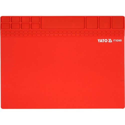 Mata silikonowa do lutowania 40x30cm Yato YT-82469 odporna jest na wysokie temperatury. Górne przegródki umożliwiają wygodne przechowywanie śrubek i akcesoriów - utrzymywane są one na znajdujący się z drugiej strony maty pasek taśmy magnetycznej. Element odporny jest na zarysowania, co zwiększa jego wytrzymałość.
