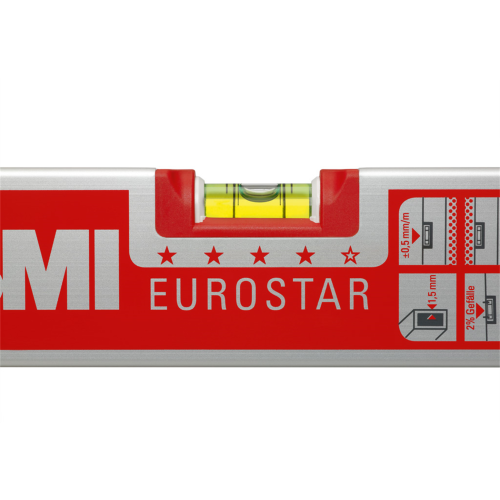 Eurostar 150 cm marki BMI to produkowana w Niemczech profesjonalna poziomica wykonana z trwałego aluminium anodowanego, wyposażona w libelle odporne na zbicie z dodatkowymi znacznikami dla instalatorów. Libelle wykonano z nietłukącego się plexiglassu, na którym laserowo naniesiono specjalne znaczniki - wewnętrzne kreski oznaczają precyzyjne położenie pęcherzyka w pozycji centralnej (ułatwia poziomowanie), a kreski zewnętrzne wskazują 2% spadku w obie strony. Co więcej, zastosowano w nich efekt lupy i filtr UV. Libelle mają okrągły kształt, dzięki czemu są łatwe w czyszczeniu, a widok bańki nie załamuje się na rogach. Pogrubiony, dodatkowo wzmocniony profil poziomicy jest bardzo sztywny, dzięki czemu zapewnia pierwszej klasy trwałość i odporność na skręcanie. Dodatkową ochronę przed skutkami upadku stanowią wysokokauczukowe pochłaniacze wstrząsów, umieszczone na obu końcach profilu. Poziomica zapewnia bardzo wysoką dokładność, unikalną funkcjonalność i znacznie wydłużony okres użytkowania.