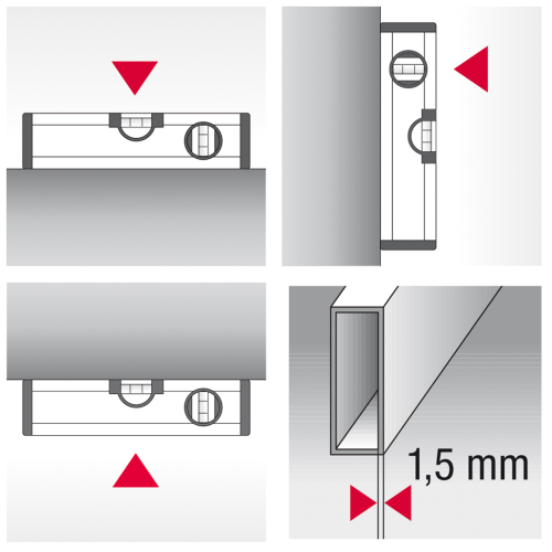 • Laserowo naniesione znaczniki poziomu i pionu gwarantują dożywotnią dokładność 0,5 mm/m