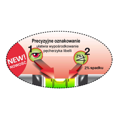 • Standardowe oraz precyzyjne oznaczenie (odstęp między kreskami na libelli ma dokładnie taką szerokość jak pęcherzyk powietrza)