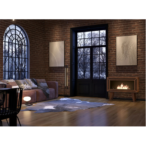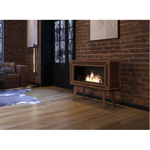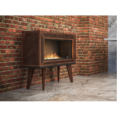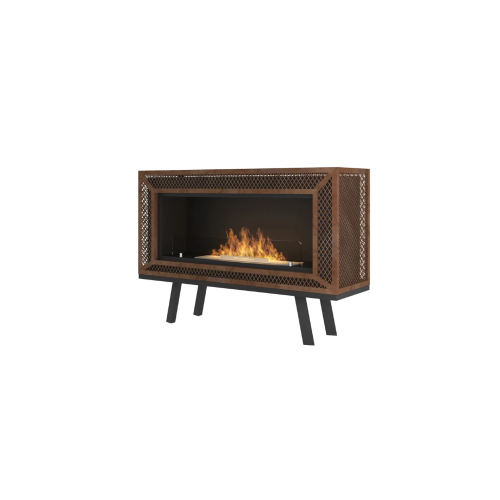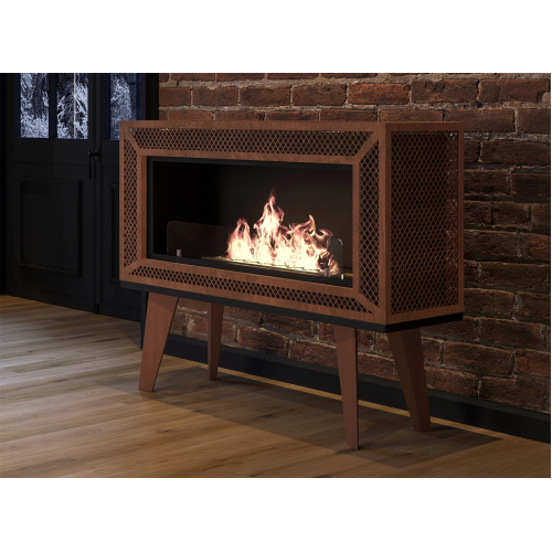 Biokominek wolnostojący INDUSTRIAL Infire wyróżnia się oryginalnym, loftowym designem. Ma drewniane nogi stylizowane na PRL i siatkę barwioną w taki sposób, aby wyglądała na skorodowaną. Świetnie będzie współgrać z industrialnymi wnętrzami. Kominek można ustawić przy ścianie, jak też uczynić z niego dekorację w centralnym punkcie pomieszczenia, gdyż cała jego bryła jest dokładnie i estetycznie wykończona z każdej strony.