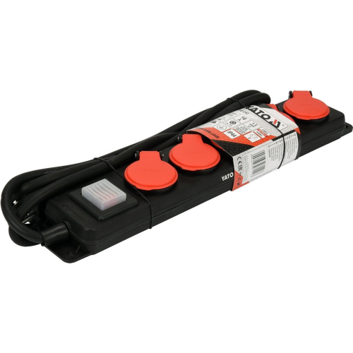 Przedłużacz listwa zasilająca Yato YT-81242 z 5 gniazdami zasilającymi. Wykonany został z mocnego i trwałego materiału, a przewód zasilający znajduje się w grubej gumie neoprenowej. Doskonale sprawdza się podczas pracy w zamkniętych pomieszczeniach, jak i na otwartej przestrzeni jak ogród czy plac budowy. Przedłużacz cechuje się wysoką szczelnością i odpornością na szkodliwe działanie pyłu oraz wyposażony został w specjalne gniazda z klapkami zabezpieczającymi przed dziećmi. Dodatkowym atutem przedłużacza są otwory montażowe, które pozwalają na łatwe powieszenie przedłużacza na ścianie.