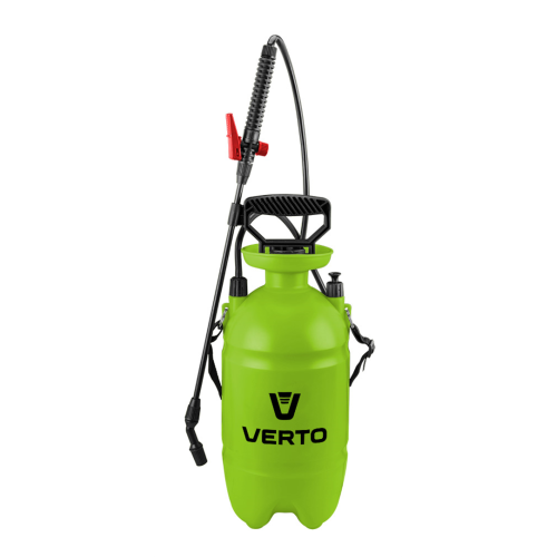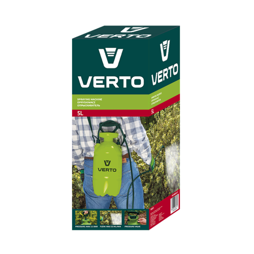 Opryskiwacz ciśnieniowy VERTO (nr ref. 15G505) o pojemności 5 litrów. Ciśnienie robocze 2.5 - 3 bary. Szeroka szyjka ułatwia napełnianie butli. Dodatkowy pasek umożliwiający zawieszenie zraszacza na ramieniu oraz blokada strumienia podnoszą komfort pracy. Zawór zapewnia bezpieczeństwo w trakcie użytkowania. Opryskiwacz można stosować w zakresie temperatur od 0 do + 45°C.