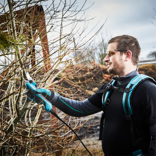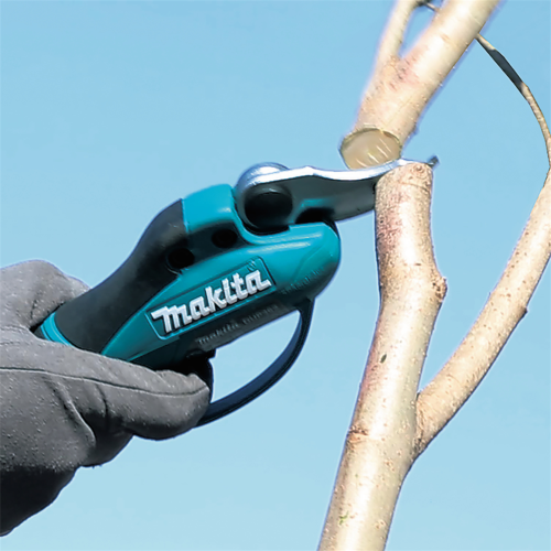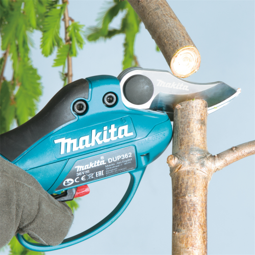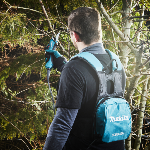 Akumulatorowy sekator ogrodniczy DUP362Z Makita należy do linii narzędzi zasilanych dwoma akumulatorami litowo-jonowymi, z tą różnicą, że baterie nie są bezpośrednio podłączone do narzędzia, a do kontrolera, który przekazuje energię. W ten sposób możliwe było stworzenie bardzo lekkiego i poręcznego sekatora, który sprawdzi się przy czasochłonnych pracach wykonywanych przez ogrodników. Napięcie akumulatorów sumuje się, dając łącznie 36V, dzięki czemu sekator zapewnia wydajne cięcie gałązek o maksymalnej średnicy 33mm. Do przenoszenia akumulatorów służy specjalny plecak, który można nosić wygodnie na plecach. Model DUP362Z jest dostarczany bez baterii i ładowarki stąd to świetna propozycja dla osób, które rozbudowują swój system ogrodowych narzędzi 18V Makita.