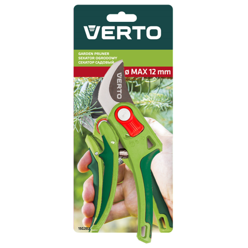 Jednoręczny sekator ogrodowy VERTO 15G202 do cięcia gałęzi drzew i krzewów. Ostrze z teflonową powłoką chroniącą przed korozją przystosowane jest do cięcia gałązek o średnicy do 12mm. Główną zaletą sekatora jest regulowany rozstaw uchwytów, który sprawia, że narzędzie jest dostosowane również do kobiecej dłoni.