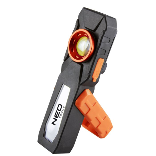 Lampa warsztatowa Neo 99-072 to urządzenie 2w1, ze względu na dodatkową funkcję latarki. Funkcja czerwonego światła poszerza zakres zastosowania, a wbudowany wskaźnik naładowania informuje o pozostałym czasie pracy. Obrotowa podstawa i gniazdo montażowe do statywu pozwalają pracować z większym komfortem.