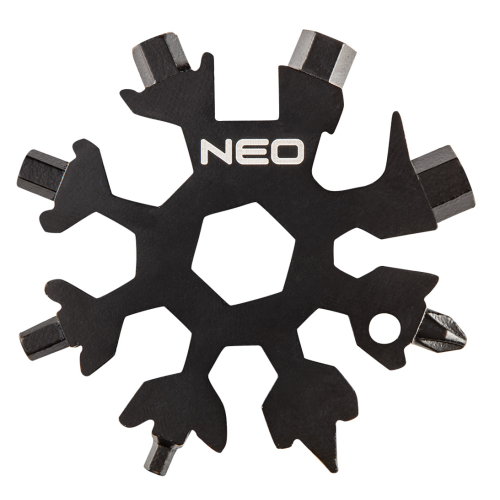 Narzędzie wielofunkcyjne - płatek śniegu 19w1 Neo GD015 wykonane z stali nierdzewnej o wysokiej trwałości i odporności na uszkodzenia. Narzędzie składa się z: klucz imbusowy 8, 9, 10, 11, 12, 13, 14, 16 mm; klucz sześciokątny 3, 4, 5, 6, 7, 8 mm; śrubokręt: płaski i krzyżakowy, otwieracz do butelek; ostrze do przecinania kartonów/paczek; otwór na klucz. Zestaw składa się z dwóch sztuk narzędzie zapakowanych w praktyczny woreczek transportowy.