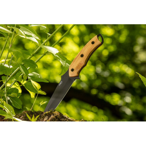 Nóż taktyczny Full-Tang 25cm 63-110 wykonany został z wysokiej jakości stali nierdzewnej, odpornej na uszkodzenia mechaniczne, dodatkowo pokrytej warstwą z tytanu. Sprawdza się podczas wszelkiego rodzaju wypraw survivalowych, biwakowania oraz rajdów terenowych. Wyposażony został w bambusową rękojeść, która zapewnia pewny chwyt podczas pracy.