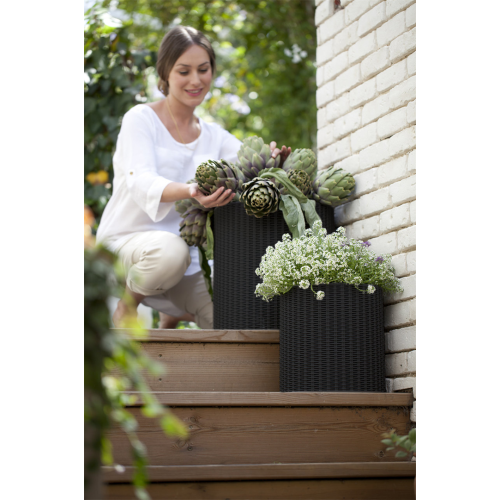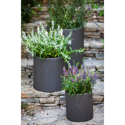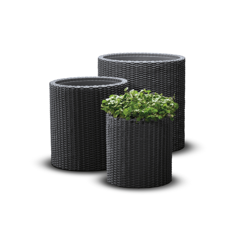 CYLINDER PLANTER to zestaw trzech donic wykonanych w klasycznym stylu. Faktura wiernie imitująca plecionkę z naturalnego rattanu idealnie sprawdzi się w każdym ogrodzie, komponując się z jego stylistyką. Idealne do ekspozycji zarówno płożących, jak i klasycznych kompozycji roślinnych. Dzięki użytym do produkcji wysokiej jakości tworzywom, donice pozostają odporne na działanie zewnętrznych warunków atmosferycznych. Wbudowany system drenażu odprowadzającego nadmiar wody jest dodatkowym atutem tych produktów.