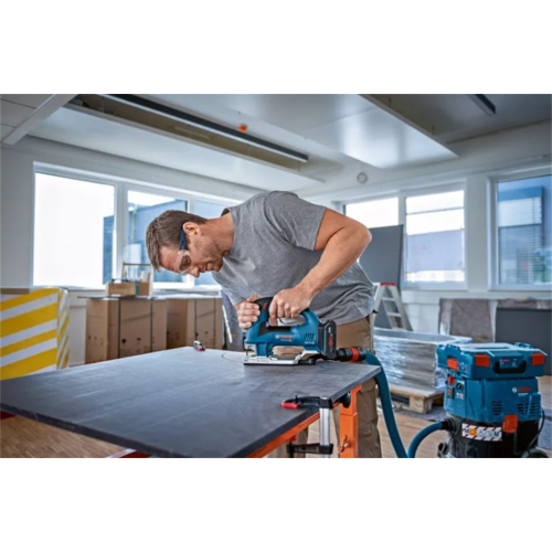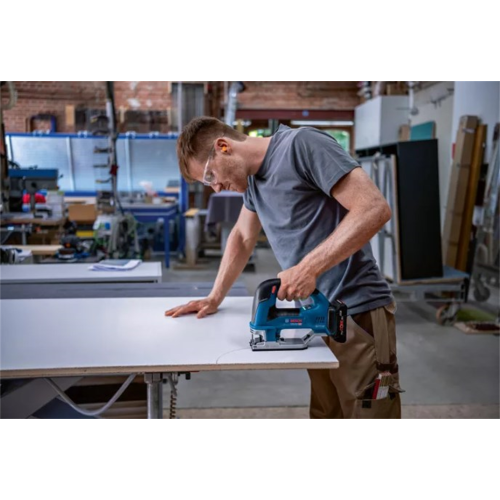 Ergonomiczny kształt zamkniętej rękojeści zapewnia pewny, stabilny chwyt, co znacząco wpływa na kontrolę nad narzędziem podczas pracy. Wykonana z wysokiej jakości materiałów, obudowa jest odporna na wstrząsy oraz zoptymalizowana pod kątem wygodnego dostępu do elementów sterujących. Dzięki zasilaniu akumulatorowemu urządzenie, zapewnia dużą mobilność i wygodę pracy bez konieczności podłączania do źródła zasilania. System regulacji prędkości pozwala na dostosowanie tempa pracy do rodzaju materiału, a prowadnica umożliwia precyzyjne prowadzenie brzeszczota po krzywiznach. Wyrzynarka jest kompatybilna z systemem przeciwpyłowym marki Bosch, co zapobiega zapyleniu miejsca pracy.