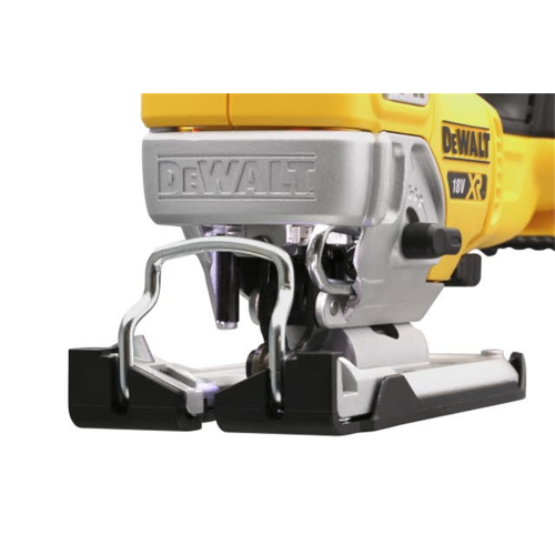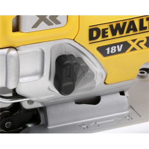 Akumulatorowa wyrzynarka DCS334N DeWALT dostarczana jest w opakowaniu kartonowym bez akumulatorów i ładowarki, dzięki czemu można samodzielnie skompletować osprzęt lub zakupić samą maszynę kompatybilną ze swoimi urządzeniami DeWALT 18V XR. Bezszczotkowa wyrzynarka akumulatorowa z uchwytem pałąkowym charakteryzuje się dużą wydajnością i ergonomią w czasie cięć od góry w linii prostej i krzywolinijne. Regulacja ruchu wahadłowego brzeszczotu i jego częstotliwości skokowej pozwala na cięcie różnych materiałów z wybraną przez siebie jakością linii cięcia. Miejsce natarcia brzeszczotu oświetlane jest dwoma diodami LED, a nadmuch z silnika oczyszcza strefę roboczą. Urobek można również zasysać odkurzaczem. Beznarzędziowa wymiana osprzętu i nastawianie kąta cięcia zapewnia szybką obsługę i łatwe przystosowanie do nowego zadania. Miękka powłoka na wąskiej rękojeści to większy komfort i kontrola pracy oraz mniejsze przenoszenie wibracji.