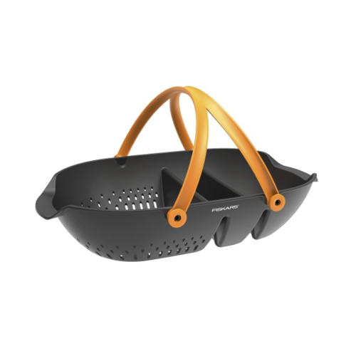 Koszyk do zbiorów warzyw i owoców Plus Fiskars 1062831 umożliwia ich wygodne przenoszenie i usprawnia mycie, dzięki części z durszlakiem z otworami. Pełna część koszyka doskonale sprawdza się do namaczania, a dodatkowa przegroda pozwala przechowywać potrzebne podczas zbiorów narzędzia. Uchwyty boczne można złożyć, celem przenoszenia koszyka jedną ręką.