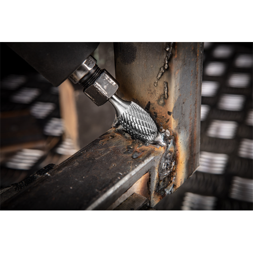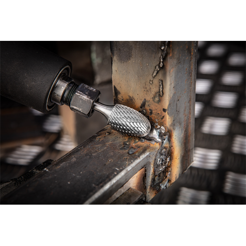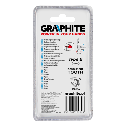Frez do metalu Graphite 55H365 typu E (owalny) i rozmiarze 10 x 16 mm to narzędzie przeznaczone do szlifierki prostej służące do skrawania lub piłowania obrabianej powierzchni. Przeznaczony do prac w materiałach takich jak metal, aluminium i tworzywa sztuczne. Zastosowanie węglika spiekanego sprawia, że narzędzie ma wysoką twardość oraz odporność na zużycie ścierne. Frez ten cechuje się podwójnymi nacięciami, które pozwalają na łatwe usuwanie naddatków w obrabianych materiałach.