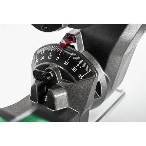 Sama głowica tnąca również podlega regulacji. Można ją pochylać na lewą stronę do 45 stopni, a odpowiednie ustawienie zblokować za pomocą specjalnego uchwytu – element ten znajduje się w łatwo dostępnym miejscu, co usprawnia luzowanie bądź dokręcanie blokady.