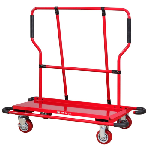 Wózek paletowy, pomocniczy, transportowy do płyt wszelkiego rodzaju i drewna Holzmann PW1000 to wytrzymały sprzęt, który doskonale sprawdzi się w magazynie, hali produkcyjnej czy hurtowni. Przeznaczony do przewożenia towarów oferuje ładowność do 1000 kg. Starannie zaprojektowana konstrukcja zapewnia stabilność, a dwa sterowalne koła sprawiają, że wózek jest zwrotny i poręczny. Kółka zostały wykonane z gumo podobnego tworzywa poliuretanowego redukującego drgania podczas ruchu, dzięki czemu wózek będzie jechał cicho po każdym rodzaju nawierzchni.