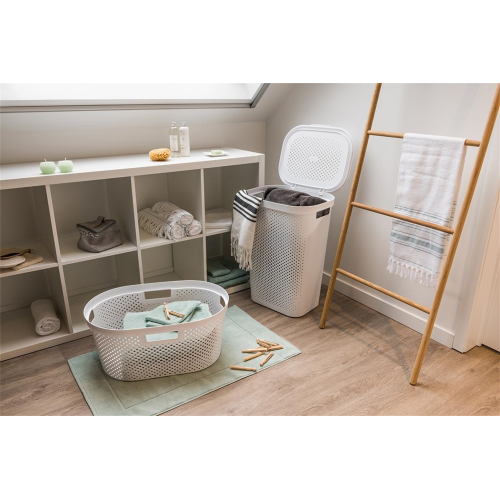 Kosz na bieliznę 231007 Infinity cechuje się prostą elegancką konstrukcją wzorowaną na skandynawskim wzornictwie. Został wykonany z polipropylenu pochodzącego w 100% z recyklingu. Dzięki dużej pojemności pomieści sporo brudnej bielizny. Posiada pokrywkę na zawiasach oraz dwa uchwyty do przenoszenia. Dzięki ażurowym ściankom wewnątrz pojemnika odbywa się ciągła cyrkulacja powietrza.