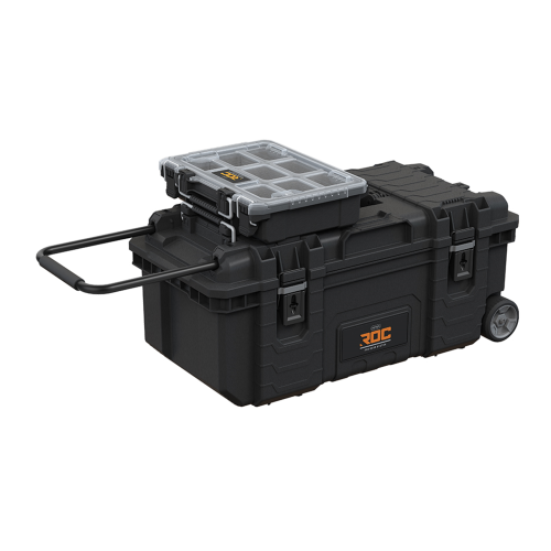 Skrzynka na kółkach 28" Keter ROC PRO GEAR 1.0 to produkt dla wymagających użytkowników, który zapewni wygodę oraz bezpieczeństwo podczas transportu narzędzi. Dla ochrony przed wodą i pyłem w pokrywie zastosowano uszczelkę. Dodatkowo skrzynka wyposażona jest w wytrzymałe zatrzaski oraz miejsce na kłódkę. W zestawie znajduje się również tacka na podręczne narzędzia. Dla wygody przenoszenia skrzynka wyposażona jest w wysuwaną, teleskopową rączkę i dwa gumowane kółka o średnicy 4". Na jej górze oraz na bokach znajdują się wygodne uchwyty. Optymalne wymiary i wytrzymała konstrukcja sprawiają, że w skrzynce można przenosić również ciężkie narzędzia o niestandardowych rozmiarach. System modułowego łączenia pozwala spersonalizować zestaw produktów linii ROC PRO GEAR według indywidualnego upodobania.