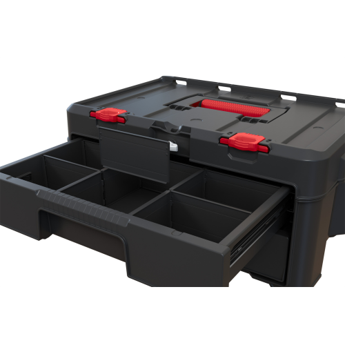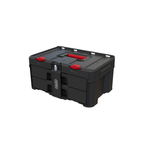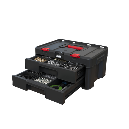 Skrzynka z 2 szufladami Stack’N’Roll to bardzo praktyczne rozwiązanie do przechowywania różnego rodzaju śrubek, gwoździ, wkrętów czy innych drobnych akcesoriów narzędziowych, a także wszelkiego rodzaju przyborów hobbystycznych. Została zaprojektowana z myślą o wszystkich, którzy cenią sobie najwyższą jakość i funkcjonalność. Pełne wysunięcie szuflad zapewnia maksymalny dostęp do zawartości, a specjalna listwa blokująca zabezpiecza przed przypadkowym wysunięciem podczas transportu. Szuflady wyposażone są w wyjmowane przegrody, które pozwalają dostosować ich przestrzeń do przedmiotów o różnych rozmiarach. Dodatkowo skrzynka posiada górną rączkę z miękkim gumowym uchwytem oraz uchwyty boczne dla wygodnego przenoszenia. Dzięki innowacyjnemu systemowi spinania jest w pełni kompatybilna z pozostałymi modułami występującymi w serii Stack’N’Roll.