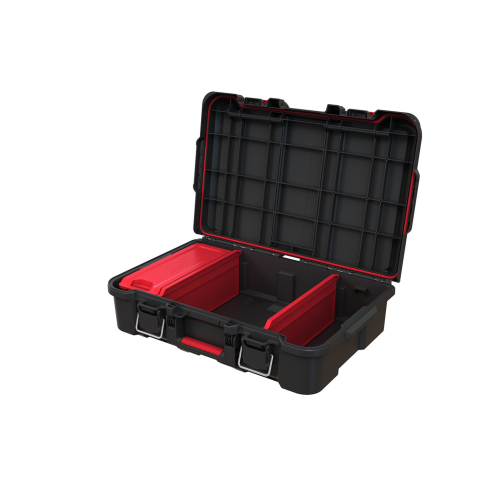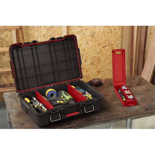 Walizka narzędziowa Stack’N’Roll stanowi idealne rozwiązanie do przechowywania elektronarzędzi bądź innych przyborów, które chcesz uchronić przed pyłem czy kontaktem z wodą. Dzięki specjalnej uszczelce w pokrywie zawartość walizki pozostaje chroniona przed czynnikami z zewnątrz. Walizka narzędziowa wyposażona jest w 2 wyjmowane przegrody oraz mały organizer na drobne części, który można zamontować wewnątrz lub umieścić na pokrywie walizki. Rączka z miękkim gumowym uchwytem zapewnia wygodę podczas przenoszenia, a boczne uchwyty pozwolą na wygodne podniesienie i przełożenie skrzynki w inne miejsce. Dzięki innowacyjnemu systemowi spinania jest w pełni kompatybilna z pozostałymi modułami występującymi w serii Stack’N’Roll.