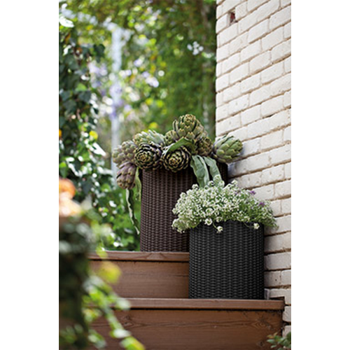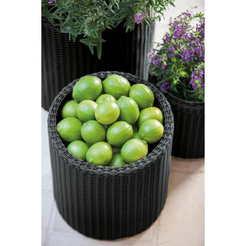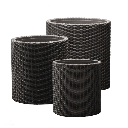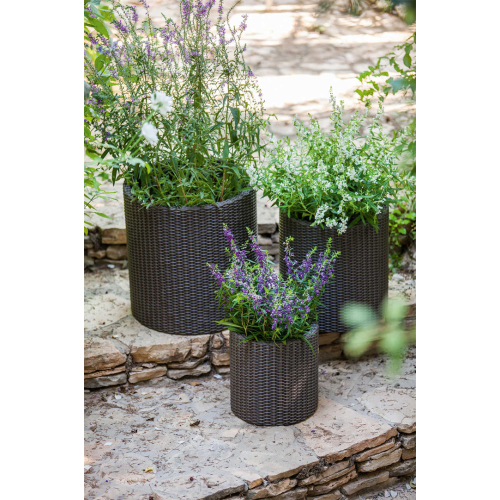 CYLINDER PLANTER to zestaw trzech donic wykonanych w klasycznym stylu. Faktura wiernie imitująca plecionkę z naturalnego rattanu idealnie sprawdzi się w każdym ogrodzie, komponując się z jego stylistyką. Idealne do ekspozycji zarówno płożących, jak i klasycznych kompozycji roślinnych. Dzięki użytym do produkcji wysokiej jakości tworzywom, donice pozostają odporne na działanie zewnętrznych warunków atmosferycznych. Wbudowany system drenażu odprowadzającego nadmiar wody jest dodatkowym atutem tych produktów.