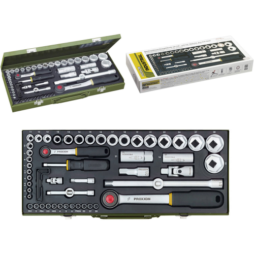 Zestaw kompaktowy kluczy nasadowych z grzechotką 1/4" 1/2" Proxxon zawiera 55 solidnie wykonanych narzędzi. Znajdą zastosowanie w każdym warsztacie i ułatwią wiele prac. Dostarczane w wygodnej kasecie. W skład zestawu wchodzą nasadki 4-32mm, nasadki do świec 16-21mm, rączka wkrętaka do nasadek z napędem czterokątnym do wkrętów z rowkiem, krzyżakowych, wkrętów typu TX oraz HX (z otworem) imbus wielkości 1.25-1.5-2.0-2.5-3.0mm.