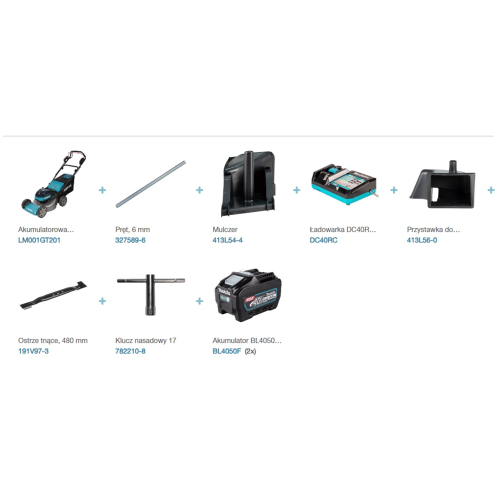 W zestawie znajdują się akumulatory BL4050F (40Vmax / 5,0 Ah) XGT oraz ładowarka DC40RC, co czyni ten model kompletnym rozwiązaniem dla wymagających użytkowników.