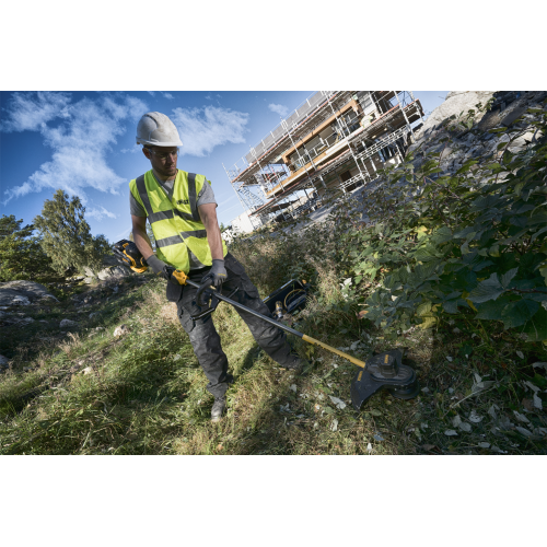 Akumulatorowa kosa DCM571X1 DeWALT zasilana jest akumulatorem FlexVolt 54V. Trzykrotnie wyższe napięcie robocze od standardowych kos 18V oraz nowoczesny silnik bezszczotkowy zapewniają doskonałe parametry pracy i wydajność porównywalną do urządzeń sieciowych lub spalinowych. Brak przewodu lub spalin to duża mobilność i wysoki komfort pracy. Wykaszarka akumulatorowa współpracuje z głowicą żyłkową do strzyżenia trawy lub z nożem do gęstych zarośli. Duża szerokość koszenia gwarantuje szybkie postępy prac, a rękojeść w kształcie litery D zapewnia dużą manewrowość i ergonomię pracy w zróżnicowanym terenie. Na szczególną uwagę zasługują dwa tryby pracy. Ponieważ urządzenie zasilane jest akumulatorami, tryb pracy o zmniejszonej prędkości obrotowej pozwala oszczędzać energię, gdy nie jest konieczna pełna moc maszyny. Tryb pracy z wysokimi obrotami gwarantuje skuteczne strzyżenie najgęściejszych traw i zarośli.