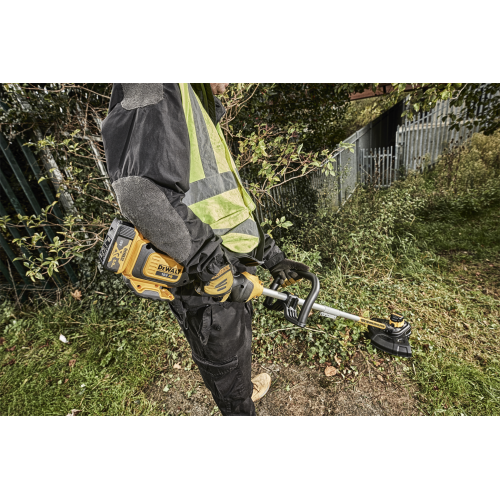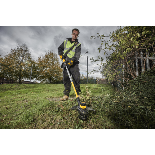 Akumulatorowa podkaszarka DCM561PBS DeWALT dysponuje drążkiem z przegubem, który pozwala na złożenie kosy do transportu i przechowywania. Bezszczotkowy silnik zasilany akumulatorami z popularnej linii 18V XR zapewnia dużą odporność na przeciążenia i efektywne wykorzystywanie energii. Technologia bezszczotkowa przyczynia się również do wyższego momentu obrotowego i dobrej współpracy z elektronicznymi systemami sterowania. Dla zmaksymalizowania skuteczności koszenia producent zastosował specjalną zębatkę zwiększającą moment obrotowy i podtrzymującą obroty pod obciążeniem. Producent zastosował także elektronikę do płynnej regulacji prędkości włącznikiem. Dodatkowo istnieje możliwość zmniejszenia maksymalnych obrotów, co wydłuża maksymalny czas pracy na jednym cyklu ładowania. Ergonomiczna rękojeść typu D i pasek na ramię optymalizują koszenie na stromych zboczach i w terenie z dużą ilością zakamarków i przeszkód.