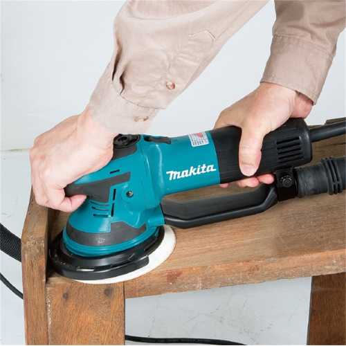 Szlifierka mimośrodowa BO6050J Makita to profesjonalne narzędzie przeznaczone do obróbki drewna. Sprzęt zaopatrzono w regulację prędkości obrotowej, co umożliwia dostosowanie odpowiedniego tempa pracy do rodzaju szlifowanej powierzchni. Model BO6050J sprawdzi się też jako polerka. Podczas obróbki pył jest odsysany poprzez dyszę wylotową umieszczoną pod rękojeścią. Dzięki zderzakowi w obrębie talerza szlifierskiego nie uszkodzimy szlifierki i obrabianego materiału podczas szlifowania w ciasnych przestrzeniach.