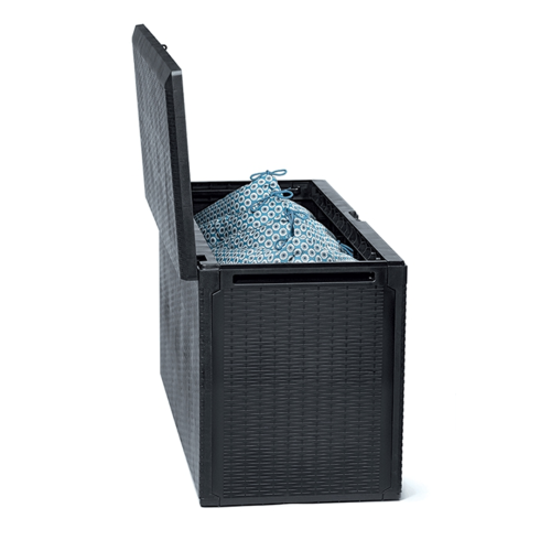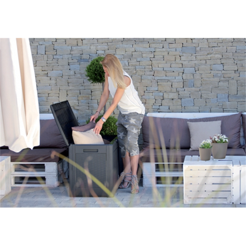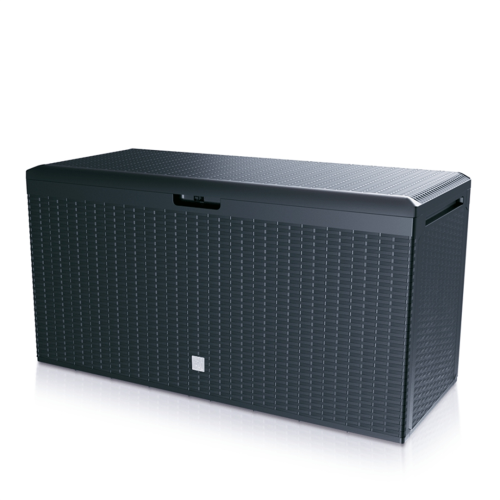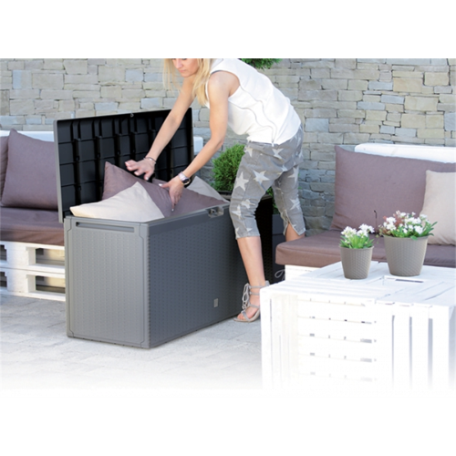 Racjonalne rozplanowanie miejsca i odpowiednie wyposażenie strefy wypoczynku gwarantuje utrzymanie porządku w dużym otwartym ogrodzie, na balkonie czy tarasie.Planując dodatkową przestrzeń estetycznego przechowywania domowych przedmiotów warto zaopatrzyć się w meble z funkcją przechowywania.Duża pojemnośc skrzyni ogrodowej Prosperplast pomoże uporać się z bałaganem. Stanowi swobodnie przemieszczany na kółkach praktyczny schowek.Lekka konstrukcja zapewnia odpowiednią wentylację i zabezpieczenie przed nagłym deszczem przechowywanych wewnątrz rozmaitych przedmiotów - poduszek na meble ogrodowe, koców, ogrodowych gadżetów, mniejszych mebli czy zabawek dla dzieci.Wbudowany uchwyt na kłódkę pozwala w łatwy sposób zabezpieczyć cenniejsze przedmioty. Panele boczne wykończone są teksturą mozaikową oraz misterną fakturą inspirowaną naturalną bambusową lub rattanową plecionką.Estetycznie wykonana, łatwa w utrzymaniu i pielęgnacji bez konieczności konserwacji, odporna na warunki atmosferyczne. Prosty montaż elementów skrzyni na zatrzask bez użycia dodatkowych narzędzi nie zajmuje wiele czasu.Dostępna w kolorze umbry i antracytu.