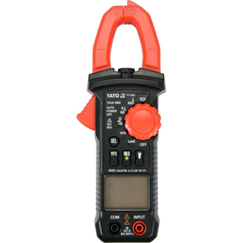 Miernik cęgowy Yato YT-73092 doskonale sprawdza się zarówno do podstawowych, jak i zaawansowanych pomiarów, dzięki automatycznemu zakresowi. Dzięki cęgom pomiarowym urządzenie mierzy natężenie prądu przemiennego w pojedynczym przewodzie za pomocą indukcji. Pomiar narzędziem odbywa się bez rozłączania obwodu, umożliwiając mierzenie wyższych natężeń, niż w przypadku mierników elektrycznych. Dodatkowa opcja NCV do bezkontaktowego wykrywania napięcia przemiennego i wykrywania przewodu fazowego przez izolację poszerzają zakres zastosowania. Funkcja TRUE RMS sprawia, że narzędzie oblicza realną wartość napięcia i natężenia prądu zarówno dla sinusoidalnych, j ka i niesinusoidalnych przebiegów. Kolejna funkcja to V.F.C - umożliwia ona odfiltrowywanie częstotliwości PWM ze sterownika VFD, przez co operator może wykonać dokładny pomiar niższych częstotliwości. Dzięki funkcji LowZ pomiar napięcia AC i DC odbywa się w niskiej impedancji, co zapewnia precyzyjny wynik bez tzw. ghost voltage. Opcja SEL służy do zmiany trybu pomiaru, np. z AC na DC. DATA HOLD pozwala zachować na wyświetlaczu aktualnie mierzoną wartość.