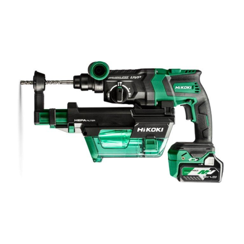Młotowiertarka SDS-Plus Hikoki DH36DPEWEZ wyposażona została w bezawaryjny silnik bezszczotkowy, dzięki któremu ma większe możliwości eksploatacyjne. Za pomocą tego narzędzia użytkownik może wiercić z udarem i bez oraz podkuwać. Mocny mechanizm udarowy pozwala pracować z twardymi materiałami, takimi jak beton. 2-buegowa przekładnia umożliwia wybór pożądanej prędkości obrotowej i ilości udarów, co w połączeniu z przyciskiem do zmiany kierunku obrotów poszerza zakres zastosowań modelu. Młotowiertarka posiada system Auto-Stop, który wprowadza możliwość zaprogramowania parametrów pracy, np. głębokości wiercenia. O bezpieczeństwo dba sprzęgło bezpieczeństwa, kontrola odrzutu RFC i funkcja automatycznego zatrzymania silnika w momencie zablokowania się wiertła. Ponadto zastosowano system antywibracyjny Hikoki UVP i zamocowano uchwyt antywibracyjny, dzięki którym drgania zostały skutecznie zredukowane. Łagodny start zwiększa wygodę przy uruchamianiu urządzenia. Wbudowana dioda LED zapewnia dobrą widoczność podczas prowadzenia działań w ciemnych pomieszczeniach. Ergonomiczna konstrukcja i uchwyt typu Soft Grip czynią użytkowanie bardziej komfortowym. W zestawie znajduje się system odpylania w postaci odpylacza cyklonowego z filtrem HEPA — dzięki niemu miejsce pracy pozostaje czystsze, miejsce wiercenia lepiej widoczne, a sama praca bezpieczniejsza.
