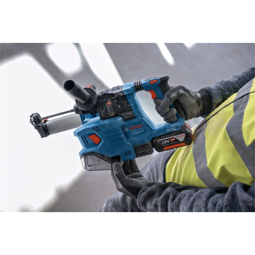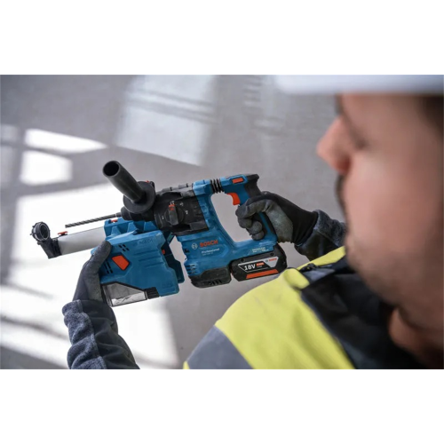 W młotowiertarce GBH 18V-22 zastosowano rozwiązania, które zapewniają większe bezpieczeństwo pracy. Funkcja KickBack Control chroni przed niekontrolowanym ruchem narzędzia w przypadku zblokowania się osprzętu w obrabianym materiale, System Vibration Control ogranicza poziom wibracji przenoszonych na dłonie użytkownika, a konstrukcja przystosowana do mocowania adapteru odsysającego pył GDE 18V-12 (do kupienia oddzielnie) pozwala pracować w bezpyłowych warunkach.