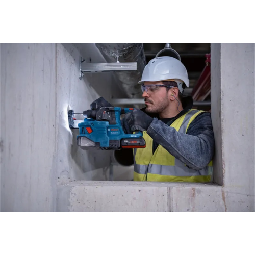 Wygodne użytkowanie to kolejna z zalet GBH 18V-22. Model ten ma wyprofilowaną, ogumowaną rękojeść tylną zapewniającą pewny chwyt, a także dodatkową rękojeść boczną dla większej kontroli podczas wymagających zadań. Jest też wyposażony w oświetlenie LED zapewniające lepszą widoczność w miejscu pracy. Udogodnienie stanowi również opcja przestawiania dłuta, umożliwiająca dopasowanie pozycji roboczej do danych warunków.