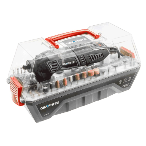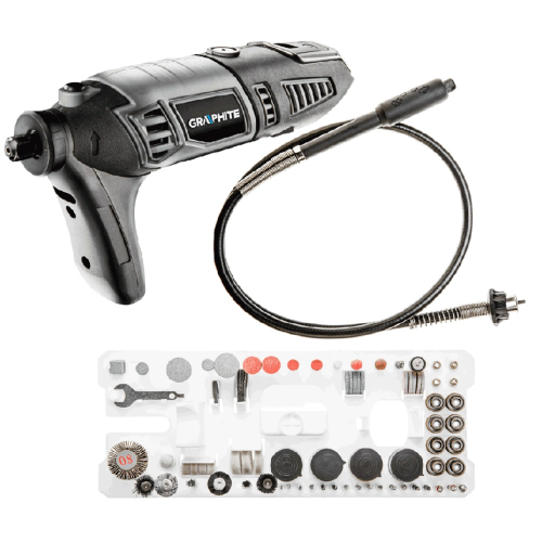 Sieciowa multiszlifierka 59G019 Graphite to wielozadaniowe elektronarzędzie, które dzięki możliwości stosowania różnego rodzaju osprzętu sprawdzi się podczas szlifowania, polerowania, cięcia, frezowania i wiercenia. Cechuje się poręczną konstrukcją. Jest dostarczana z wałkiem giętkim, który dodatkowo ułatwia wykonywanie precyzyjnych prac. Multiszlifierka to świetne narzędzie do wszelkich prac rękodzielniczych. Jest wyposażona w regulację prędkości, co pozwala odpowiednio dopasować tempo pracy do rodzaju wykonywanej obróbki. Bogaty zestaw akcesoriów, który jest dostarczany wraz z elektronarzędziem, pozwoli wykonywać najróżniejsze projekty.