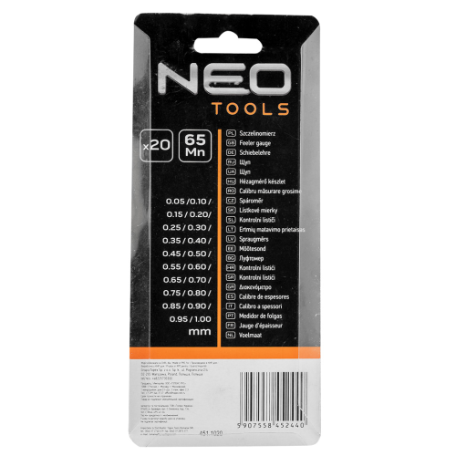 Szczelinomierz Neo 11-191 o zakresie od 0.05 do 1.0 mm. Posiada 20 stalowych listków stopniowanych co 0.05 mm. Znajduje zastosowanie w warsztacie, np. przy pomiarach luzów zaworowych w silnikach samochodów. Marka Neo spełnia oczekiwania profesjonalistów.