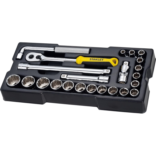 Zestaw kluczy nasadowych Stanley 1/2" 12-kątnych to doskonałe rozwiązanie dla profesjonalistów i majsterkowiczów, którzy cenią sobie wysoką jakość i funkcjonalność. W komplecie znajduje się szereg akcesoriów, które idealnie sprawdzą się przy różnorodnych zadaniach. Zestaw został zaprojektowany jako część systemu Transmodule, co pozwala na łatwą integrację z kompatybilnymi wózkami warsztatowymi, zapewniającymi porządek i wygodę przechowywania.