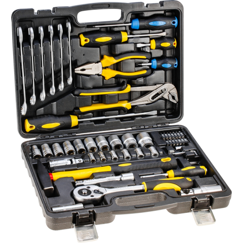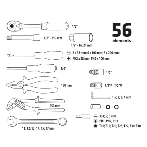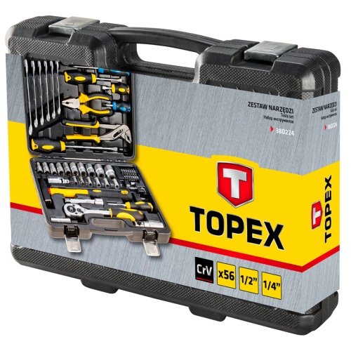 Zestaw narzędzi ręcznych 38D224 Topex jest dedykowany dla majsterkowiczów. Składa się z 56 elementów m.in. wkrętaków, nasadek, kluczy płasko-oczkowych, grzechotki, szczypiec. Wszystkie narzędzia zebrano w praktycznej walizce z tworzywa sztucznego, która ułatwia przechowywanie oraz przenoszenie narzędzi. Zestaw posłuży w wielu pracach montażowych czy naprawczych.