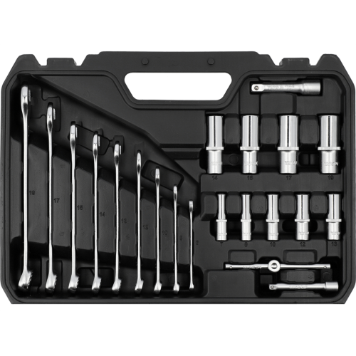 W zestawie znajdują się nasadki z napędem AS-Drive, który odpowiada za optymalne przeniesienie momentu obrotowego bez ryzyka ślizgania się nasadki czy uszkodzenia krawędzi śrub lub nakrętek. Uwagę zwracają też grzechotki z 72 zębami. Umożliwiają one precyzyjne działanie na ograniczonej przestrzeni. Dzięki ergonomicznym, ogumowanym rękojeściom pewnie też leżą w dłoni, co przekłada się na większą wygodę użytkowania.