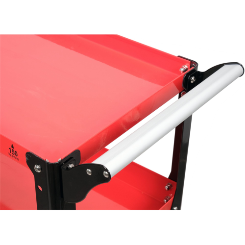 Wózek został wykonany z wytrzymałej blachy stalowej malowanej proszkowo, dzięki czemu cechuje się trwałością. Konstrukcja o nośności 150 kg sprawdza się przy przechowywaniu ciężkich przedmiotów, a 3 półki – jedna płytsza o głębokości 40 mm i dwie głębsze 80-milimetrowe – zapewniają dużą elastyczność w rozmieszczeniu narzędzi itp.